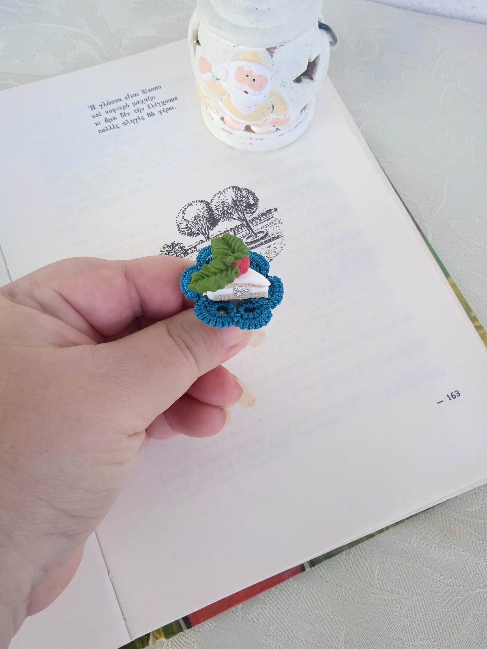 Χειροποίητη μίνι βασιλόπιτα, εμπνευσμένη από το παραδοσιακό πρωτοχρονιάτικο γλυκό. Απεικονίζει ένα κομμάτι βασιλόπιτας με λευκό γλάσο, πράσινο φύλλο και κόκκινη λεπτομέρεια, τοποθετημένο σε πλεκτή μπλε βάση που προσθέτει ιδιαίτερο χαρακτήρα και ζεστασιά.