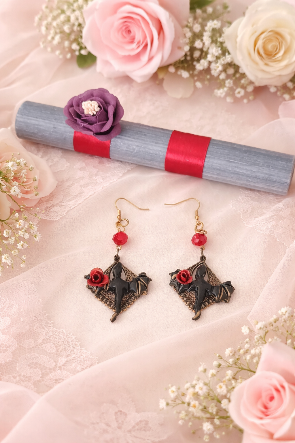 Σκουλαρίκια με σχέδιο δράκου και κόκκινο τριαντάφυλλο