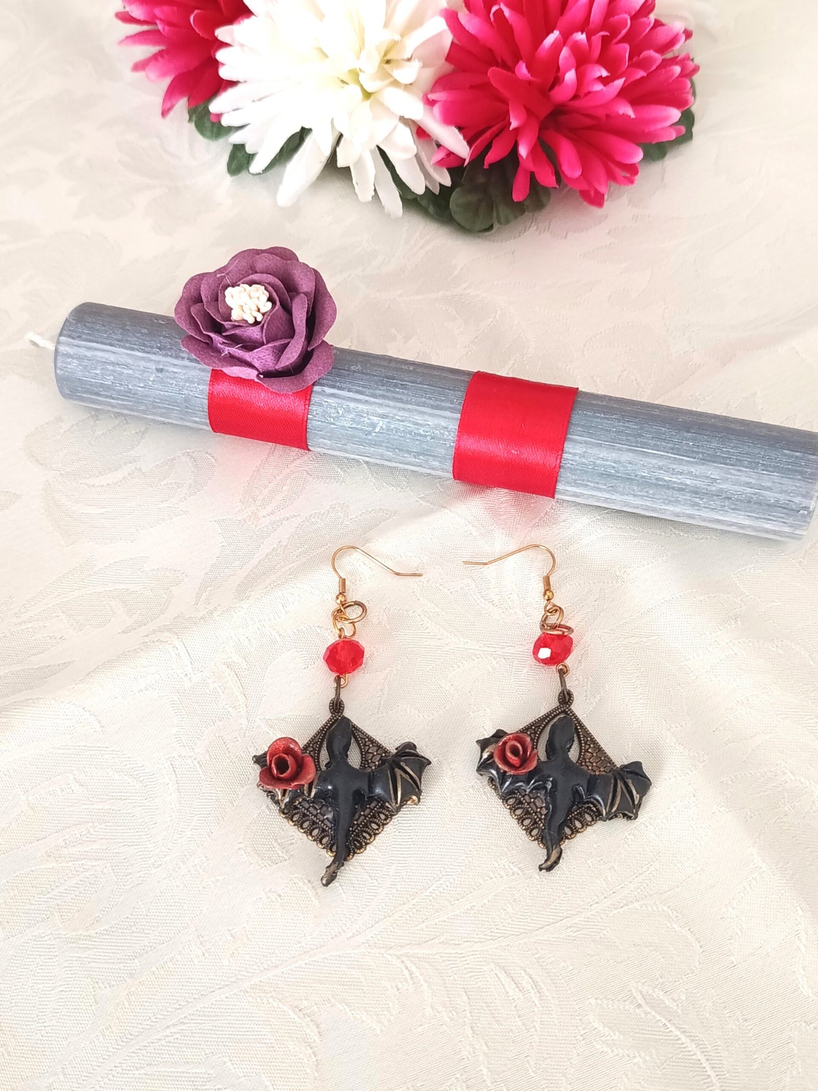 Χειροποίητη πασχαλινή λαμπάδα εμπνευσμένη από τη δύναμη και το μυστήριο του δράκου της φωτιάς. Η κομψή γκρι λαμπάδα διακοσμείται με κόκκινη σατέν κορδέλα και ένα ιδιαίτερο ζευγάρι σκουλαρίκια με φιγούρα δράκου, που αγκαλιάζει ένα κόκκινο τριαντάφυλλο.