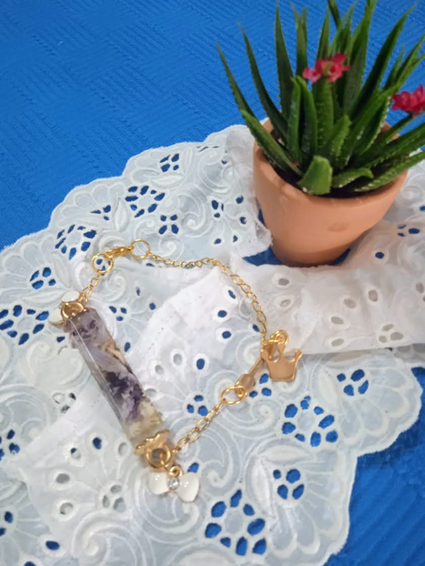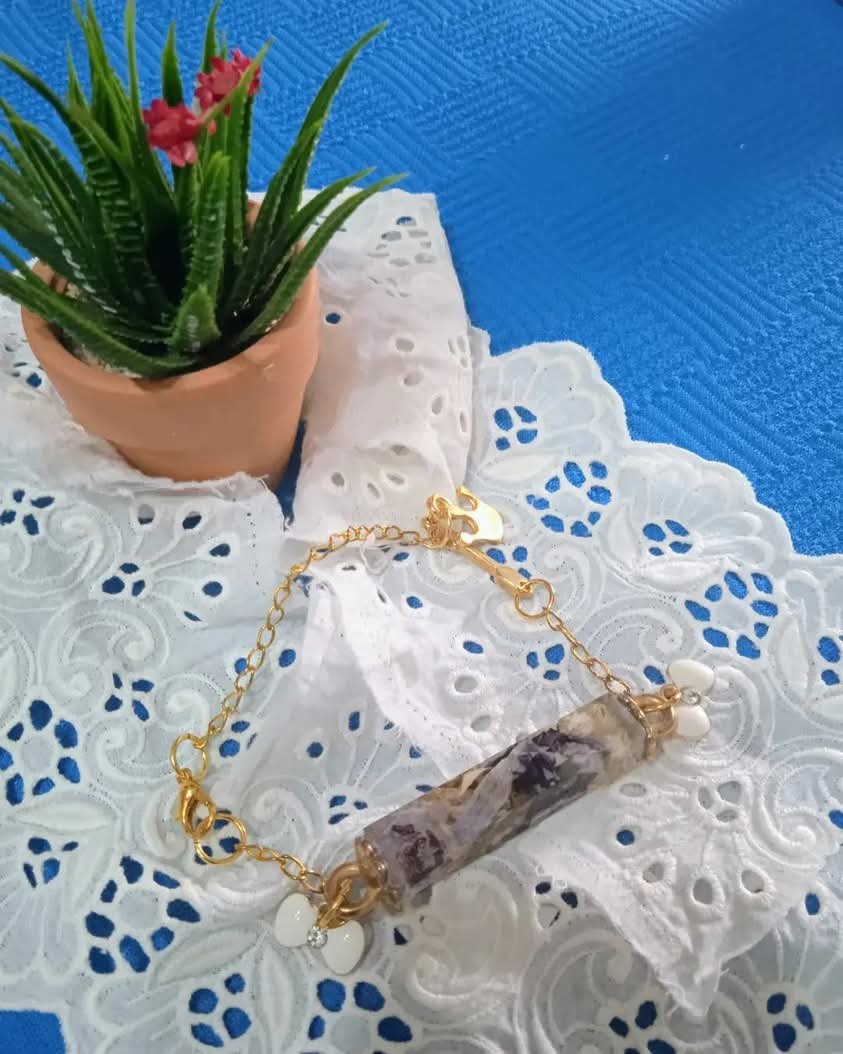 Ένα ρομαντικό βραχιόλι με αποξηραμένα λουλούδια του αγρού μέσα σε υγρό γυαλί πλαισιώνεται από χρυσές λεπτομέρειες χρυσή ατσάλινη αλυσίδα προσαρμόζεται σε κάθε χέρι τέλειο ιδανικό δώρο και για τις δασκάλες και για την γιορτή της μητέρας